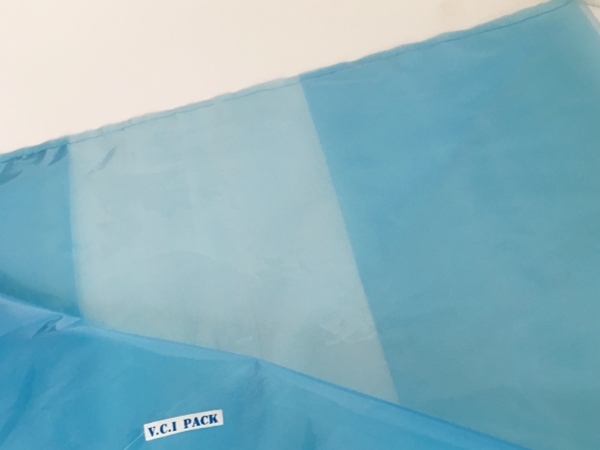 VCI氣相防銹膜(防銹袋)是將高分子聚乙烯樹脂(LDPE)與功能VCI樹脂配比混合,采用現(xiàn)代薄膜共擠技術(shù)生產(chǎn)的新一代復(fù)合防銹薄膜。具有良好的氣化防銹性能、阻隔防潮、使用方便、透明直觀等特點;當(dāng)用塑料袋包裹金屬產(chǎn)品時,氣相緩蝕劑在封閉空間內(nèi)氣化并凝聚在所有金屬表面上形成氣相保護(hù)層,從而防止金屬產(chǎn)品銹蝕。符合GB-T19532-2004防銹性能要求。