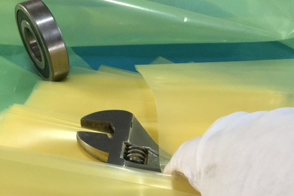 VCI氣相防銹膜(防銹袋)是將高分子聚乙烯樹脂(LDPE)與功能VCI樹脂配比混合,采用現(xiàn)代薄膜共擠技術生產(chǎn)的新一代復合防銹薄膜。具有良好的氣化防銹性能、阻隔防潮、使用方便、透明直觀等特點;當用塑料袋包裹金屬產(chǎn)品時,氣相緩蝕劑在封閉空間內(nèi)氣化并凝聚在所有金屬表面上形成氣相保護層,從而防止金屬產(chǎn)品銹蝕。符合GB-T19532-2004防銹性能要求。